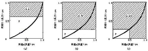 圖中劃斜線部分的面積表示風(fēng)量調(diào)到0.5(Pu)時(shí)的節(jié)電量。變頻調(diào)速的情況下所需電源功率僅為全風(fēng)量的12.5%當(dāng)然這是理想情況下得到的結(jié)果。