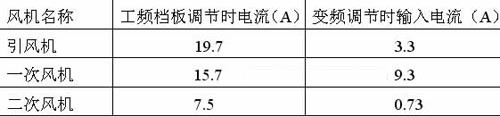 由于在相同條件下風(fēng)壓和流量的大小與電機(jī)電流的大小成正比所以這里只用工頻運(yùn)行檔板調(diào)節(jié)時(shí)的電機(jī)電流和變頻調(diào)節(jié)時(shí)變頻器的輸入電流作一比較從而說明節(jié)電效果。