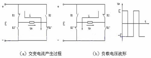 當(dāng)兩組開關(guān)K1、K1’和K2、K2’輪流切換時(shí),負(fù)載R上便得到了交變電壓uR。如果這兩組開關(guān)利用四只電子開關(guān)器件來代替并輪流導(dǎo)通與關(guān)斷就實(shí)現(xiàn)了由四只電子開關(guān)器件控制的直流——交流逆變。