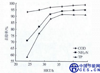 固定兩級好氧池DO 在3.5 mg/L、MLSS 為3 300mg/L,改變兩級A/O 裝置中HRT,考察HRT 對廢水中COD、NH3-N、TP 去除率的影響,結果見圖 2。