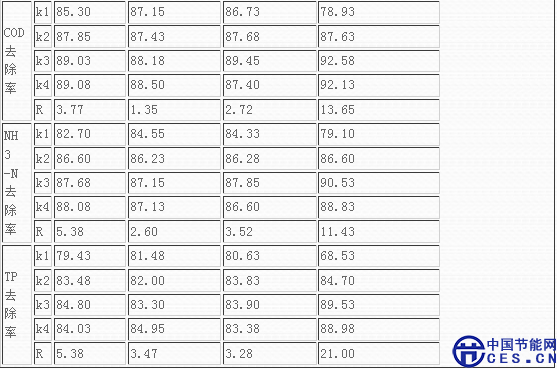 從表 1 可以看出,以COD 去除率為檢測指標最佳組合工藝為A4B4C3D3,以NH3-N 去除率為檢測指標最佳組合工藝為A4B3C3D3,以TP 去除率為檢測指標最佳組合工藝為A3B4C3D3。因COD、NH3-N 的A3、A4相差較小,而A4會增加不少投資,所以與TP 去除率結合選擇A3;COD、TP 選B4,而NH3-N 的B3、B4相差很小,因此取B4。根據正交試驗分析可知,最佳工藝參數選擇為A3B4C3D3,即:HRT=36 h、初級好氧池DO 為4.0 mg/L、次級好氧池DO 為3.5 mg/L、MLSS 為3 560 mg/L。