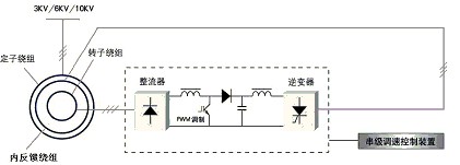 因而,串能調(diào)速具有以控制低電壓進而控制高壓電機,以控制小功率進而控制大功率電機且系統(tǒng)結(jié)構(gòu)簡單,節(jié)電率高的特點,對于大多數(shù)泵、風(fēng)機類需要低同步轉(zhuǎn)速調(diào)速(由額定轉(zhuǎn)速下調(diào))的應(yīng)用特別適合。特別對高壓大容量電機更有技術(shù)實現(xiàn)容易和經(jīng)濟性好的優(yōu)勢。
