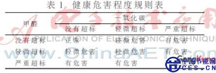 以國家室內(nèi)空氣質(zhì)量標(biāo)準(zhǔn)GB/T18883-2002作為參考,對數(shù)據(jù)融合后的數(shù)據(jù)進(jìn)行模糊化處理[7]。為每個(gè)參數(shù)在其取值范圍上定義3個(gè)概念,比如一氧化碳濃度(0~30 mg/m3)定義3個(gè)概念(未超標(biāo)、輕微超標(biāo)、嚴(yán)重超標(biāo)),選用梯形隸屬度函數(shù)。一氧化碳與甲醛作為人體健康主要的影響因素,需要將一氧化碳以及甲醛所得的語言值進(jìn)行綜合處理求出健康危害程度,相應(yīng)的健康危害程度規(guī)則如表1所示。通過以上的數(shù)據(jù)處理可以為用戶提供更加直觀易懂的語言信息。 根據(jù)各個(gè)參數(shù)的語言值提供建議或提醒,如當(dāng)空氣中危險(xiǎn)氣體濃度將要超過標(biāo)準(zhǔn)數(shù)值時(shí),提醒用戶開窗通風(fēng),保持空氣流通;當(dāng)家居環(huán)境濕度過低時(shí),提醒用戶注意保持空氣濕潤,并且會提出建議,提供能保持潮濕的有效措施,這樣有助于保持人居健康環(huán)境。