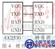 它使用SoC(片上系統(tǒng)),是Broadcom公司的BCM2835,其中CPU以ARM11為核心,接口包括2個(gè)USB2.0接口并且支持USB Hub擴(kuò)展,同時(shí)擁有視頻模擬信號的電視輸出接口和HDMI高清視頻輸出接口、一個(gè)以太網(wǎng)接口、8XGPIO、一組UART、一組I2C以及兩個(gè)選擇的SPI總線[4]。 ZigBee協(xié)調(diào)器負(fù)責(zé)各ZigBee終端節(jié)點(diǎn)的通信管理、數(shù)據(jù)的傳輸以及動態(tài)組網(wǎng)。本系統(tǒng)中ZigBee協(xié)調(diào)器選用的是德州儀器公司的CC2530芯片,它是基于2.4 GHz IEEE802.15.4、ZigBee和RF4CE的片上系統(tǒng)解決方案,支持低功耗及安全可靠的無線通信。 樹莓派接口中含有一路UART串行接口,其第8引腳是TXD,第10引腳是RXD。利用該接口可以與ZigBee協(xié)調(diào)器連接和通信。其硬件連接示意圖如圖4所示。