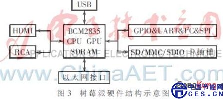 2.1 控制中心硬件設(shè)計(jì) 本系統(tǒng)中,控制中心的控制器采用樹莓派(Raspberry pi),它是一款基于ARM的微型電腦主板,又稱卡片式電腦,是由英國慈善組織“Raspberry Pi 基金會”開發(fā)的。樹莓派是一個(gè)開源的硬件,可支持Linux操作系統(tǒng),其硬件結(jié)構(gòu)示意圖如圖3所示。