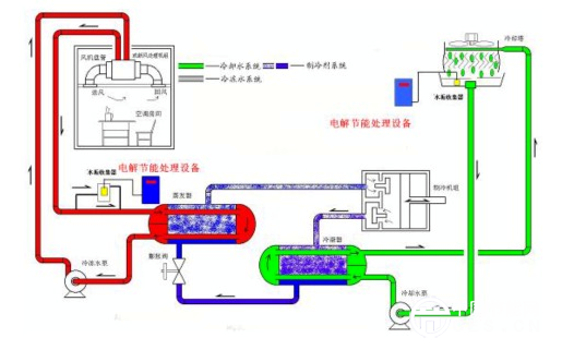 低壓高頻、變頻的電解,使循環(huán)水(大分子團水)電解成具有強溶解性和滲透性的小分子還原水。小分子還原水具有溶解水垢的能力,能起到代替化學藥劑的作用。浸在水中的負極水垢收集器,使溶解后帶正電的鈣鎂離子在收集器上結晶析出,達到去除循環(huán)水中鈣鎂離子的目的,使水體硬度大大降低,減少了換熱器表面發(fā)生結垢的機會,從而起到防垢、除垢的作用,提高了換熱效率,實現(xiàn)換熱器的節(jié)能運行。(注:大分子團水由10個以上水分子組成,小分子水由低于5個水分子組成。普通水電位在+100mv以上,電解還原水為帶有負電位(-250mv以下)的水)