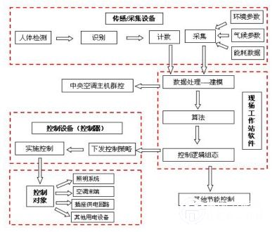 本技術(shù)采用RF射頻技術(shù)、紅外技術(shù)或熱成像技術(shù)對人體移動熱源(即建筑內(nèi)移動用能負(fù)荷)進行監(jiān)測,配合環(huán)境及氣象參數(shù)采集、預(yù)置時間策略、能源管理策略與能耗數(shù)據(jù)分析模型構(gòu)成的智能化室內(nèi)節(jié)能控制系統(tǒng);針對室內(nèi)照明開關(guān)、供電插座、空調(diào)末端實施(無線)聯(lián)網(wǎng)的、精細(xì)化節(jié)能管理;通過后臺軟件的集成管理,及時反饋末端的溫濕度、開啟狀態(tài)、人數(shù)等,通過建立動態(tài)模型來聯(lián)動BA系統(tǒng),支持控制樓層風(fēng)柜、新風(fēng)機、中央冷凍站空調(diào)機組的開啟、變頻調(diào)節(jié)、溫度調(diào)節(jié),調(diào)整系統(tǒng)的控制策略,提升系統(tǒng)能效比;與其它建筑機電設(shè)備智能控制系統(tǒng)共同構(gòu)筑完整的建筑整體節(jié)能控制系統(tǒng)。