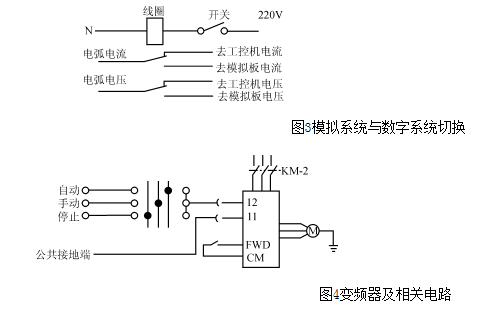 本系統(tǒng)分為手動(dòng)和自動(dòng)兩種工作狀態(tài),其中自動(dòng)工作狀態(tài)又分為模擬狀態(tài)和數(shù)字狀態(tài)。在自動(dòng)工作狀態(tài)時(shí),通過轉(zhuǎn)換開關(guān),可使繼電器觸點(diǎn)選擇模擬通路或數(shù)字通路(其中數(shù)字通路一般接常閉觸點(diǎn)),切換結(jié)構(gòu)如圖3所示。手動(dòng)工作狀態(tài)下,電路實(shí)現(xiàn)較為簡單,它不經(jīng)過中間電路和信號(hào)處理過程便可直接驅(qū)動(dòng)變頻器。所以它的優(yōu)先級(jí)較高,故適用于在緊急情況下的應(yīng)急操作,其與自動(dòng)狀態(tài)下的切換如圖4所示。