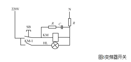 富士變頻器端子12為設(shè)定電壓輸入端,端子11為模擬信號(hào)公共端,F(xiàn)WD為運(yùn)行/停止命令端,CM為接點(diǎn)輸入公共端。因?yàn)椴荒懿捎弥苯咏油ㄅc斷開主電路電源的方法來操作變頻器的運(yùn)行與停止。采用圖5所示的電路,在保持主電路接通的情況下,只需按按鈕開關(guān)SB,使交流接觸器線包帶電,吸合KM1使指示燈亮,KM2給變頻器送電(見圖4)。