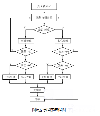 輸入輸出采集運(yùn)算是本系統(tǒng)的核心部分,在沿襲前輩工作經(jīng)驗(yàn)的基礎(chǔ)上,通過跳線和小型轉(zhuǎn)換開關(guān),選擇出適合于系統(tǒng)的輸入輸出通道與形式(PCL為高集成板,提供了多種功能選擇,如可以電壓形式輸出,也可以電流形式輸出等)。在控制運(yùn)算過程中根據(jù)電弧爐的點(diǎn)弧期,熔化期,精煉期以及鋼水出爐前弧流弧壓的不同狀況,在控制子程序的算法實(shí)施上應(yīng)有所區(qū)別,其程序流程圖如圖6所示。在控制過程中充分利用了G11變頻器電壓速率的特點(diǎn)(如圖7所示),降低了硬件的設(shè)計(jì)復(fù)雜度。電流設(shè)定值和電壓設(shè)定值的確定,根據(jù)外部電路所能提供的電源電壓而選擇不同的轉(zhuǎn)換算法。軟件中僅僅考慮采集與轉(zhuǎn)換是不夠的,本系統(tǒng)對(duì)于數(shù)據(jù)處理采用的是PID控制算法??刂品绞缴?,模擬系統(tǒng)通過硬件電路來實(shí)現(xiàn),而軟件設(shè)計(jì)則是通過PID算法來完成的。為了保證冶煉的溫度恒定,又要電極的運(yùn)動(dòng)不會(huì)出現(xiàn)太大波動(dòng),就在控制系統(tǒng)中增設(shè)給定積分環(huán)節(jié)。對(duì)電路的參數(shù)設(shè)定可借鑒模擬調(diào)節(jié)器的參數(shù),衰減曲線法等,取得良好的比例積分(PI)控制參數(shù)。