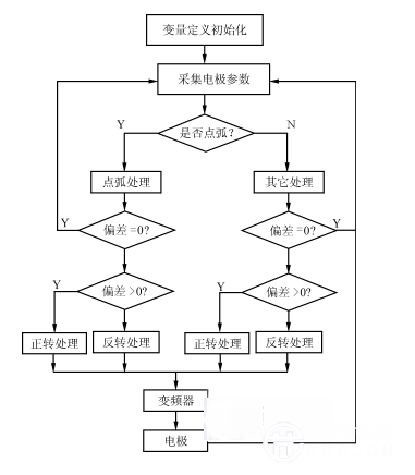 為了易于控制與維護(hù),電極的每一相都為一套獨(dú)立設(shè)備(包括傳感器,變頻器,電機(jī)和印刷線路板),為此在控制軟件的設(shè)計(jì)中采用分相進(jìn)行獨(dú)立控制的原則。此外,額定電流的設(shè)定和電源模塊的供電所需要的0~12V電源,可通過小型變壓器和WY17812,WY27912等組成的電路來實(shí)現(xiàn),此處不一一詳述。