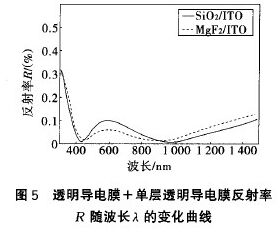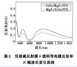 再看另外兩種情況,Si02/ITO(d=103nm、75nm)和MgF2/ITO(d=111nm、75nm),反射率隨波長的變化曲線如圖5所示,在300~450nm和900~1500nm范圍內,Si02/ITO優(yōu)于MgF2/ITO;而在450~900nm范圍內,MgF2/ITO明顯優(yōu)于SiO2/ITO.經(jīng)過計算,siO2/ITO的加權平均反射率為5.57%,而MgF2/ITO的加權平均反射率為3.72%,可見在相同情況下減反射膜材料的折射率低一些效果會更好.