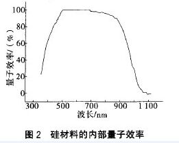 式中,V為該波長光的相對視敏度;P為其輻射功率.Q(λ)為硅的內部量子效率,由圖2得到;R(λ)為減反射膜在對應波長點的反射率,由式(1)、式(2)得到;λ1、λ2為光譜波長上下限,λ1=350 nm、λ2=1 120 nm.加權平均透射率為Tw=1-Rw.