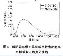 為了說明問題,首先選擇2種組合,即MgF2/ITO(d=111 nm、75 nIn),Ti02/ITO(d=65nm、75nm),它們的反射率隨波長的變化曲線如圖4.從圖4中可以看出,在光譜響應范圍內,透明導電膜與低折射率減反射膜的組合比低折射率透明導電膜加高折射率減反射膜的效果好.上面兩種組合的加權平均反射率分別為3.72%<span style="font-family:; font-size: 10.5pt;" mso-fareast-language:zh-cn;mso-bidi-language:ar-sa"="" mso-bidi-font-family:宋體;mso-font-kerning:0pt;mso-ansi-language:en-us;="" minor-latin;mso-fareast-font-family:宋體;mso-hansi-theme-font:minor-latin;=""> 和30.53%,由此可見,MgF2/ITO明顯優(yōu)于TiO2/ITO.