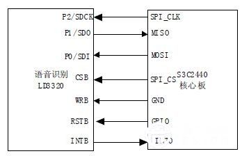 為了使系統(tǒng)能夠識別操作人員發(fā)出的語音指令,設計中采用了由ICRoute公司設計生產(chǎn)的非特定人語音識別芯片LD3320,它集成了語音識別處理電路和一些外部電路,包括AD、DA轉換器、麥克風接口、聲音輸出接口等,不需要外接任何的輔助芯片如Flash、RAM。在主控制器的控制下,可以識別出預先添加到識別列表中的內容。設計中參考了ICRoute發(fā)布的LD3320數(shù)據(jù)手冊,圖中LD3320的P0、P1、P2引腳通過SPI接口與嵌入式處理器相接,控制信號WRB、CSB、RSTB以及中斷返回信號引腳INTB與處理器S3C2440直接相連,如圖3所示。