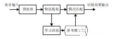 語音識別主要包括兩個階段:訓練階段和識別階段。在訓練或識別過程中,都必須對輸入語音進行預處理和特征提取。訓練階段通過用戶輸入的若干次訓練語音,經(jīng)過預處理和特征提取后得到特征參數(shù),最后通過特征參數(shù)建模,進而建立訓練語音的參考模型庫。而識別階段是將輸入語音的特征矢量參數(shù)和參考模型庫中的參考模型進行相似性度量,然后把相似度最高的輸入特征矢量作為識別結果輸出,從而達到語音識別目的,如圖1所示。