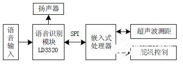 硬件電路主要包括語音識別部分、主控部分、超聲波測距部分和舵機控制部分,如圖2所示。處理器為三星公司的S3C2440,系統(tǒng)主頻最高可達533MHz,支持SPI、I2C、UART等接口,能夠滿足控制系統(tǒng)的需求。主控芯片S3C2440通過SPI總線完成對語音識別模塊的讀寫操作,超聲波測距部分和舵機控制部分由處理器的GPIO進行統(tǒng)一控制。