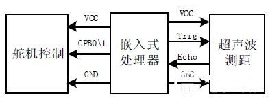 超聲波測距模塊的感應角度小于15°,為了擴大測距的感應角度范圍,將超聲波測距模塊安裝在兩自由度云臺上,其中,舵機為SG90(9G),旋轉角度為180°。處理器通過GPB0和GPB1分別控制兩個舵機以實現(xiàn)云臺的旋轉,以測量不同方向的障礙物,如圖4所示。