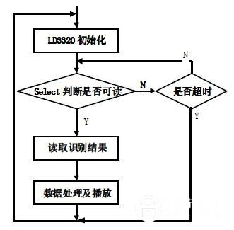 語音識別功能的驅動程序工作流程為通用初始化à語音識別用初始化→寫入識別列表→開始識別→響應識別中斷。為了提高識別成功率,在識別列表中增加了“垃圾關鍵詞”以吸收錯誤的識別。上層應用程序為語音識別功能分配了單獨的進程,通過ioctl()函數(shù)控制LD3320的工作狀態(tài),read()函數(shù)可以讀取識別結果。程序中使用select機制實現(xiàn)read()函數(shù)的非阻塞訪問。同時,設定select監(jiān)控超時時間,在超時后,重新初始化語音識別芯片LD3320,為下一次語音識別做準備,如圖6所示。