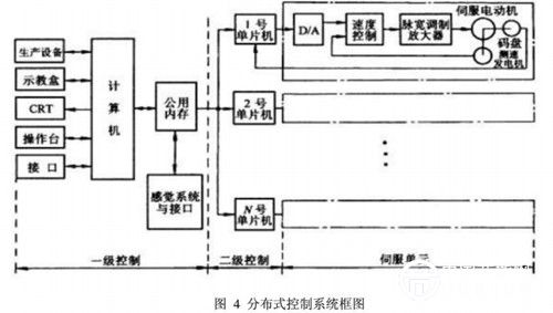 對于具有多自由度的工業(yè)機器人而言,集中控制對各個控制軸之間的藕合關系處理得很好,可以很簡單的進行補償。但是,當軸的數(shù)量增加到使控制算法變得很復雜時,其控制性能會惡化。而且,當系統(tǒng)中軸的數(shù)量或控制算法變得很復雜時,可能會導致系統(tǒng)的重新設計。與之相比,分布式結構的每一個運動軸都由一個控制器處理,這意味著,系統(tǒng)有較少的軸間禍合和較高的系統(tǒng)重構性。