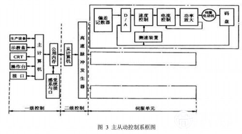 2)主從控制系統(tǒng):采用主、從兩級處理器實現(xiàn)系統(tǒng)的全部控制功能。主CPU實現(xiàn)管理、坐標變換、軌跡生成和系統(tǒng)自診斷等:從CPU實現(xiàn)所有關節(jié)的動作控制。其構成框圖,如圖3所示。主從控制方式系統(tǒng)實時性較好,適于高精度、高速度控制,但其系統(tǒng)擴展性較差,維修困難。