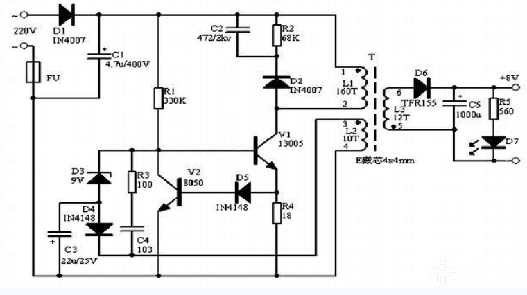 市電經(jīng)D1整流及C1濾波后得到約300V的直流電壓加在變壓器的①腳(L1的上端),同時(shí)此電壓經(jīng)R1給V1加上偏置后后使其微微導(dǎo)通,有電流流過L1,同時(shí)反饋線圈L2的上端(變壓器的③腳)形成正電壓,此電壓經(jīng)C4、R3反饋給V1,使其更導(dǎo)通,乃至飽和,最后隨反饋電流的減小,V1迅速退出飽和并截止,如此循環(huán)形成振蕩,在次級(jí)線圈L3上感應(yīng)出所需的輸出電壓。L2是反饋線圈,同時(shí)也與D4、D3、C3一起組成穩(wěn)壓電路。當(dāng)線圈L3經(jīng)D6整流后在C5上的電壓升高后,同時(shí)也表現(xiàn)為L(zhǎng)2經(jīng)D4整流后在C3負(fù)極上的電壓更低,當(dāng)?shù)椭良s為穩(wěn)壓管D3(9V)的穩(wěn)壓值時(shí)D3導(dǎo)通,使V1有基極短路到地,關(guān)斷V1,最終使輸出電壓降低。電路中R4、D5、V2組成過流保護(hù)電路。當(dāng)某些原因引起V1的工作電流大太時(shí),R4上產(chǎn)生的電壓互感器經(jīng)D5加至V2基極,V2導(dǎo)通,V1基極電壓下降,使V1電流減小。D3的穩(wěn)壓值理論為9V+0.5~0.7V,在實(shí)際應(yīng)用時(shí),若要改變輸出電壓,只要更換不同穩(wěn)壓值的D3即可,穩(wěn)壓值越小,輸出電壓越低,反之則越高。