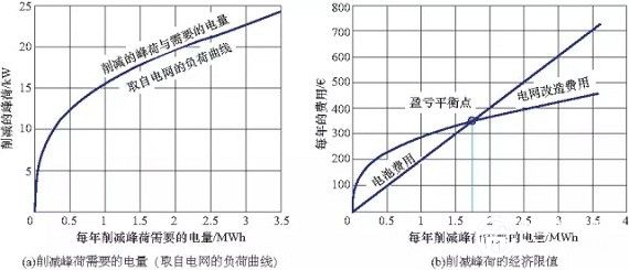 儲(chǔ)能電池在電網(wǎng)低負(fù)荷時(shí)段充電,高峰負(fù)荷時(shí)刻放電,電池的投資成本見(jiàn)圖7。在圖9中,圖9(a)表示在電網(wǎng)經(jīng)濟(jì)限值(邊際成本)下電網(wǎng)可削減的峰荷大小;圖9(b)顯示當(dāng)儲(chǔ)能電池容量較小時(shí),電網(wǎng)改造費(fèi)用和電池費(fèi)用之間的差值較小。在圖9(b)中的盈虧平衡點(diǎn)處,電網(wǎng)避免或延遲投資所節(jié)省的費(fèi)用與增加電池所增加的投資費(fèi)用相等,此時(shí),用于削峰的電池容量為1.75MWh/a,可削減峰荷為19kW[見(jiàn)圖9(a)]。如果需要削減的峰荷大于盈虧平衡點(diǎn)處需要的電池容量值,則電池將會(huì)被損壞而縮短電池壽命,使得電池成本高于通過(guò)節(jié)省電網(wǎng)容量所獲得的效益。