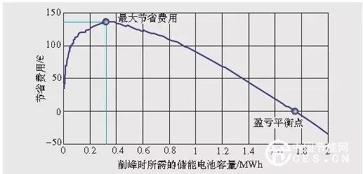 圖10所示為采用不同的儲(chǔ)能電池容量時(shí)所節(jié)省的電網(wǎng)改造的費(fèi)用,從中可以看出,當(dāng)削減的峰荷為10.9kW時(shí),節(jié)省的電網(wǎng)改造費(fèi)用最大,為136€/a,此時(shí)需要儲(chǔ)能電池的充放電量為0.342MWh/a。
