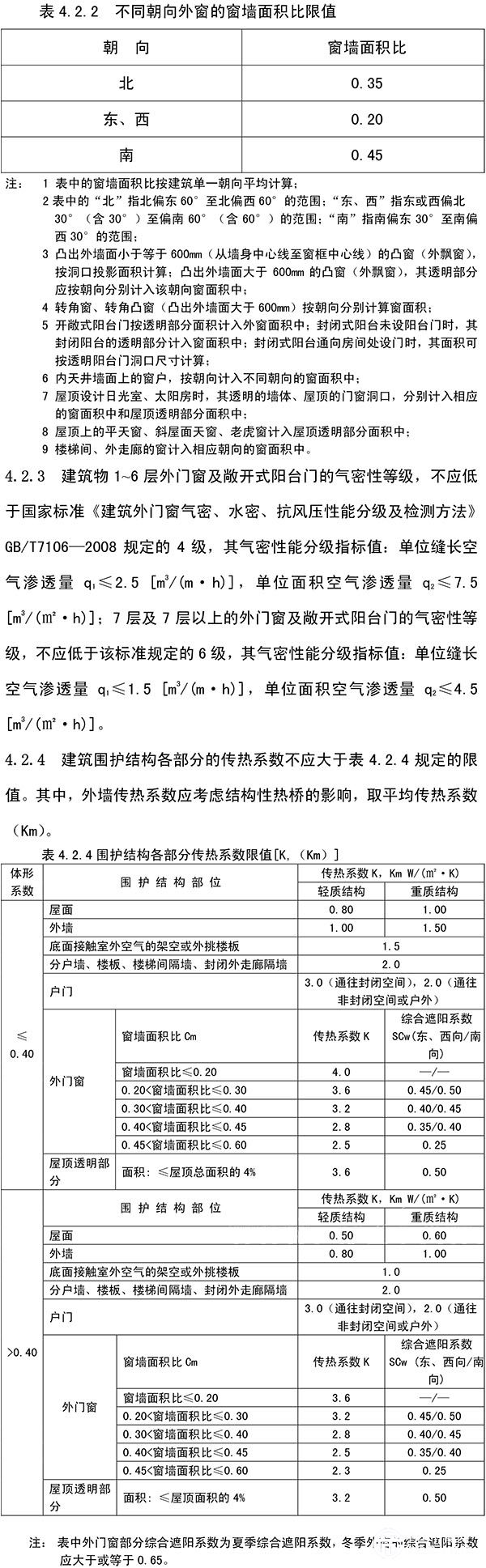 4.2.2外門窗(包括幕墻、陽臺門的透明部分)的面積不應(yīng)過大,不同朝向的窗墻面積比,不應(yīng)超過表4.2.2的規(guī)定。不同朝向、不同窗墻面積比的外窗,其傳熱系數(shù)和綜合遮陽系數(shù)不應(yīng)超過表4.2.4的規(guī)定。