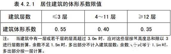 4.2.1建筑外形設(shè)計宜減少外圍護結(jié)構(gòu)的表面積。居住建筑的體形系數(shù)不應(yīng)大于表4.2.1規(guī)定的限值。