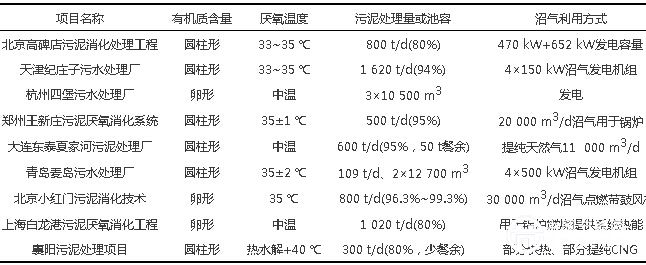 我國污泥厭氧消化技術起步較早,但技術應用發(fā)展較慢,與發(fā)達國家相比差距較大。目前建立污泥厭氧消化系統(tǒng)的污水處理廠數量并不多,僅在北京、上海、天津、重慶、青島、石家莊、鄭州、沈陽、南京、濟南、襄陽等城市的約50座大中型污水處理廠中建設了一批污泥消化設施,目前仍可使用的只有20余處(部分典型污泥厭氧消化項目如表2所示),其中運行效果較為突出的有上海白龍港污泥厭氧消化工程、大連東泰夏家河污泥處理工程、青島麥島中溫厭氧消化工程、襄陽污泥綜合處置示范工程等,其它大部分未運行或中途停運。究其原因,除了消化污泥土地利用政策和管理支撐力度不足、沼氣利用缺少激勵機制外,我國已建污水廠多采用低負荷處理工藝(泥質有機質含量低)也是重要影響因素[16]。