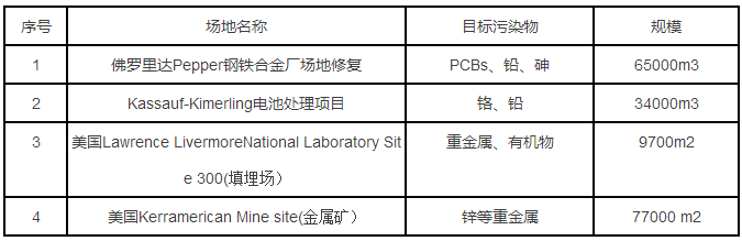 污染土壤阻隔填埋技術(shù)早在20世紀(jì)80年代初期就已經(jīng)開始應(yīng)用,該技術(shù)在國外已經(jīng)應(yīng)用30多年,已成功用于近千個(gè)工程,技術(shù)已經(jīng)相對比較成熟,國外部分案例信息表如下。
