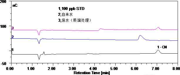 在新近發(fā)布的水質中氰化物的檢測方法,采用ThermoScientific™Dionex™ICS-2100RFIC-EG離子色譜儀,此方法采用基于離子交換分離原理,在ThermoScientific™Dionex™IonPac™AS7陰離子交換柱上可較好實現(xiàn)氰化物和基體中其它共存陰離子型化合物的分離,再經(jīng)過安培檢測器檢測還原性的氰根離子,可以獲得µg/L甚至ng/L的測定下限,而樣品僅需簡單濾過即可。水樣中若是關注游離氰化物可經(jīng)簡單處理后直接分析,若是關注總氰化物,則可以通過酸化蒸餾,再用氫氧化鈉溶液吸收后直接進樣檢測。