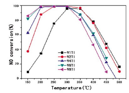 釩含量直接影響脫硝催化劑活性,釩含量增加促進(jìn)低溫活性,但降低高溫脫硝選擇性,增加SO2氧化率。鎢是傳統(tǒng)脫硝催化劑中的重要助劑,添加后可以提高催化劑的低溫活性,但在釩負(fù)載量較高時(shí),鎢負(fù)載量的增加導(dǎo)致高溫段活性略有下降。