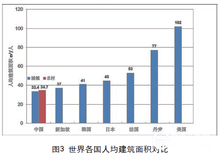 圖3列出世界上一些國家和地區(qū)目前的人均建筑擁有量包括住宅和公共建筑)??梢钥闯?,亞洲國家和地區(qū)與歐美等早期發(fā)展起來的發(fā)達國家人均建筑擁有量有很大不同,其中既有土地狀況的原因,更有可從海外獲取資源規(guī)模的原因。從目前世界政治和經(jīng)濟格局看,我國這樣的大國很難依靠大量進口滿足我國發(fā)展的各種資源需求,而我們擁有的各類人均資源大部分又遠低于世界平均水平,因此我國的經(jīng)濟發(fā)展必須建立在節(jié)約資源的基礎(chǔ)上。房屋建設(shè)是高資源消耗型產(chǎn)業(yè),從資源環(huán)境條件來看,我國未來的發(fā)展不可能走歐美國家的模式,而應該參照亞洲的發(fā)達國家或地區(qū)發(fā)展模式。像日本、韓國、新加坡,人均建筑面積都是在40 m2左右,我國也應把人均量控制在這個范圍。如果控制在40~45m2之間,按照未來14.7億人口計算,總的建筑規(guī)模應該約為600億m2。