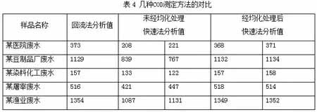 表4數(shù)據(jù)是一組對比實驗的結(jié)果,可以看出:樣品經(jīng)水浴超聲器均化作用前后,COD快速測定法的分析值相差懸殊;水樣經(jīng)均化、混勻處理后,快速測定法的分析值與標準回流法分析值一致。表明水樣只有經(jīng)充分均勻混合后其COD快速測定法的分析值才能真實反映該樣品的COD值。