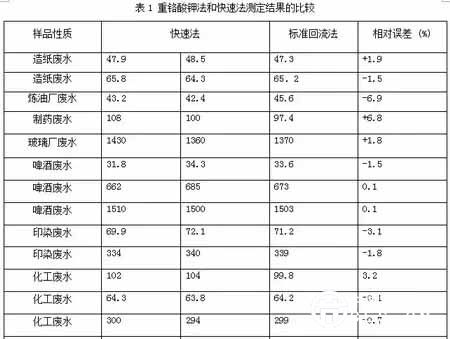 大量統(tǒng)計檢驗表明,CODcr快速測定法與標準回流法比較,其分析結(jié)果無顯著性差異,在準確度、精密度方面與標準回流法具有可比性(見表1)。目前,已在環(huán)境監(jiān)測的實際工作中得到了進一步的推廣使用。