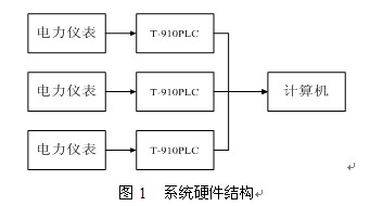 各裝置安裝于該電站電力控制室內(nèi),主要由T-910PLC、電力儀表、計(jì)算機(jī)、RS485數(shù)據(jù)線組成。根據(jù)各單元的資源情況和對(duì)終端功能的要求,完成硬件電路連接的設(shè)計(jì)如圖1所示。