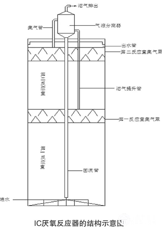 內循環(huán)(IC)厭氧反應器是在上流式厭氧污泥床(UASB)反應器基礎上發(fā)展起來的高效反應器。其依靠沼氣在升流管和回流管間產生的密度差在反應器內部形成流體循環(huán)。