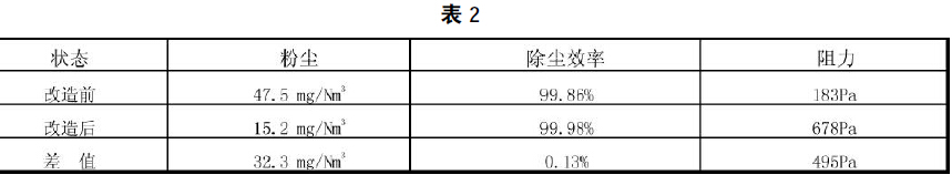 (1)電袋復(fù)合式除塵器改造前后煙塵排放濃度及本體阻力對(duì)比(見表2)。