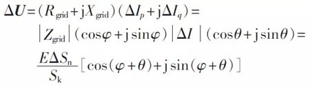 在風(fēng)速擾動下,DFIG 注入微電網(wǎng)系統(tǒng)功率變化時,會使線路上的電流產(chǎn)生 ΔI 的變化,在風(fēng)機并網(wǎng)點的電壓變化值為: