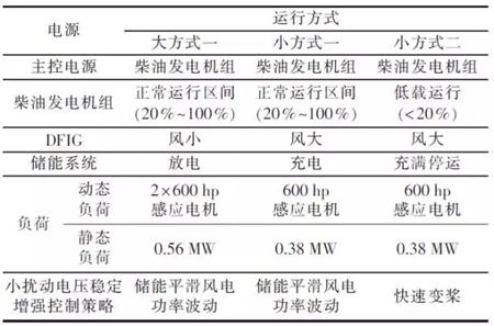 考慮東澳島微電網(wǎng)電源構(gòu)成及出力特性,采用的運行方式安排與小擾動電壓穩(wěn)定增強控制策略如下表所示。