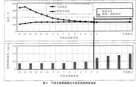 各個風(fēng)箱的酸露點,如圖5所示。圖5示出了4-12號風(fēng)箱的酸露點區(qū),這一結(jié)果證實了將該區(qū)域風(fēng)箱材質(zhì)由碳鋼改為不銹鋼的正確性,以應(yīng)對腐蝕加重情形。氣體主管路的酸露點及腐蝕損耗速度如圖6所示。由圖6可見,1號氣體主管路后面是酸露點區(qū),因此將2-15號氣體主管路自2011年起更換為碳鋼材質(zhì),采用該方案可節(jié)省管路更換費用。當(dāng)然,可通過改變操作來調(diào)節(jié)酸露點區(qū),因此最好每年都繪制一次酸露點圖,并對氣體進(jìn)行檢測。