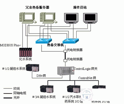 第三步:由于該系統(tǒng)涉及DH+網(wǎng)、MB+網(wǎng)、ControlNet網(wǎng)等多種現(xiàn)場總線,需設(shè)一網(wǎng)關(guān)ControlLogix Gateway 完成協(xié)議的轉(zhuǎn)換。該網(wǎng)關(guān)應(yīng)具備:一、接收現(xiàn)場總線各網(wǎng)段上的數(shù)據(jù),并將其進(jìn)行解釋,轉(zhuǎn)化為以太網(wǎng)所能接收的形式,向交換機傳送;二、把系統(tǒng)發(fā)出的命令和數(shù)據(jù)轉(zhuǎn)換為現(xiàn)場總線各網(wǎng)段的數(shù)據(jù)格式,向下傳送。鑒于此,考慮到地理位置,決定在凝結(jié)水精處理控制室設(shè)一網(wǎng)關(guān),該網(wǎng)關(guān)上配有DH+模塊、ControlNet模塊、Ethernet模塊等。