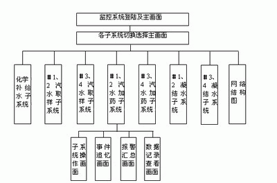 系統(tǒng)監(jiān)控畫面采用層次型結(jié)構(gòu)設(shè)計,各子系統(tǒng)之間很容易切換,直觀反映現(xiàn)場工況,且便于操作人員使用,簡潔、直觀、功能完善是它的最大特點。采用層次型結(jié)構(gòu)便于操作人員完成多個子系統(tǒng)的準(zhǔn)確切換,避免由于系統(tǒng)結(jié)構(gòu)繁瑣造成的誤操作。各子系統(tǒng)也采用相近的功能菜單,切換方便,功能完善,在同一幅主畫面內(nèi)可完成多項操作功能,且各子菜單均為彈出式。監(jiān)控畫面組成結(jié)構(gòu)如圖5所示。其中,各子系統(tǒng)均有和#1、2汽水加藥子系統(tǒng)相似的子畫面,結(jié)構(gòu)圖中沒有逐個列出。