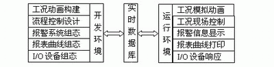 無論是美國Wonderware公司推出的世界上第一個工控組態(tài)軟件Intouch還是現(xiàn)在的各類組態(tài)軟件,從總體結(jié)構(gòu)上看一般都是由系統(tǒng)開發(fā)環(huán)境(或稱組態(tài)環(huán)境)與系統(tǒng)運行環(huán)境兩大部分組成。系統(tǒng)開發(fā)環(huán)境是自動化工程設(shè)計師為實施其控制方案,在組態(tài)軟件的支持下進(jìn)行應(yīng)用程序的系統(tǒng)生成工作所必須依賴的工作環(huán)境,通過建立一系列用戶數(shù)據(jù)文件,生成最終的圖形目標(biāo)應(yīng)用系統(tǒng),供系統(tǒng)運行環(huán)境運行時使用。系統(tǒng)運行環(huán)境是將目標(biāo)應(yīng)用程序裝入計算機內(nèi)存并投入實時運行時使用的,是直接針對現(xiàn)場操作使用的。系統(tǒng)開發(fā)環(huán)境和系統(tǒng)運行環(huán)境之間的聯(lián)系紐帶是實時數(shù)據(jù)庫,它們?nèi)咧g的關(guān)系如圖2所示。