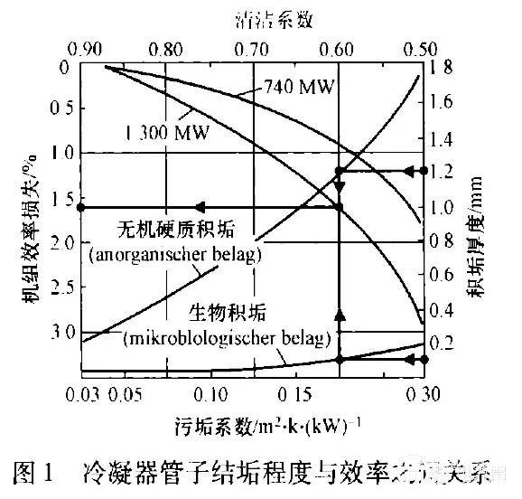 圖l中上部?jī)蓷l斜向右下方的曲線分別代表740Mw和1300Mw透平機(jī)組的污垢系數(shù)或清潔系數(shù)與機(jī)組效率損失的關(guān)系。當(dāng)清潔系數(shù)為0.60(即當(dāng)生物積垢達(dá)0.1mm,或無機(jī)硬質(zhì)垢達(dá)1.2mm時(shí)),300MW機(jī)組效率下降達(dá)1.6%。