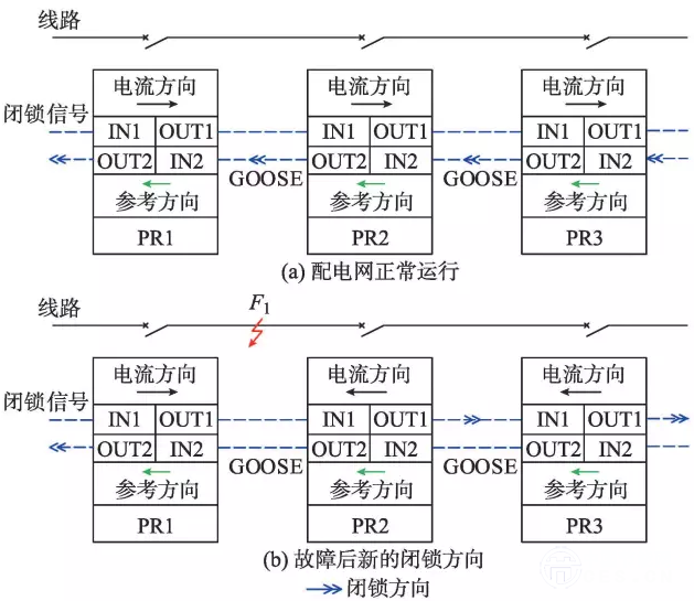 若故障電流與參考方向同向, 則閉鎖方向與參考方向反向。閉鎖信號(hào)由IN1、OUT1收發(fā);