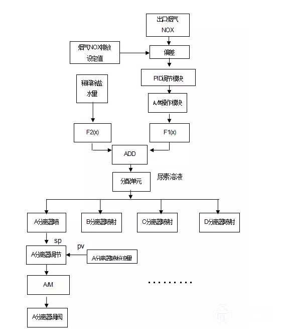 兩部分并不相互獨(dú)立,通過值班員設(shè)定煙氣NOX定值,與實(shí)測的鍋爐出口的排放值的偏差送至PID調(diào)節(jié)單元,實(shí)現(xiàn)偏差調(diào)節(jié),在通過動(dòng)態(tài)試驗(yàn)確定的溶液和稀釋水的匹配函數(shù)關(guān)系式實(shí)現(xiàn)進(jìn)入鍋爐前尿素溶劑總量控制。