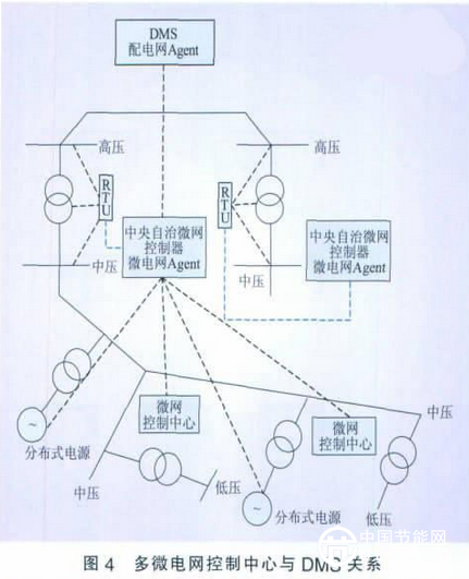 通過構(gòu)建一個松耦合的應(yīng)用系統(tǒng),模塊之間不但可以解耦,模塊間接口都有相應(yīng)的規(guī)范,由組件管理平臺對所有模塊進(jìn)行統(tǒng)一管理(加載、卸載、啟動、停止)。當(dāng)需要對某一模塊,如狀態(tài)估計模塊升級時,只需將新模塊放在某一目錄下,組件管理平臺會自動加載該模塊,測試無誤后,終止原有模塊運(yùn)行;也就是說,軟件升級過程中,整個系統(tǒng)可照常運(yùn)行,軟件升級簡單方便,順應(yīng)電網(wǎng)快速發(fā)展的需求?;诙啻砑夹g(shù)的控制還可以實(shí)現(xiàn)微電網(wǎng)與配電管理系統(tǒng)(DMS)之間的協(xié)調(diào)控制。目前的研究主要是對微電網(wǎng)中頻率、電壓等進(jìn)行控制。要求微電網(wǎng)并網(wǎng)時,輸出電壓自動跟蹤電網(wǎng)電壓變化。多微電網(wǎng)控制中心與DMS關(guān)系如圖4所示。